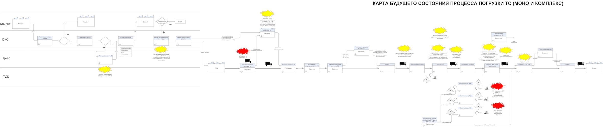 Для 1-го варианта была создана карта будущего состояния процесса отгрузки. Также был сформирован перечень эскизных (предварительных) решений для достижения будущего целевого состояния процесса отгрузки ГП.